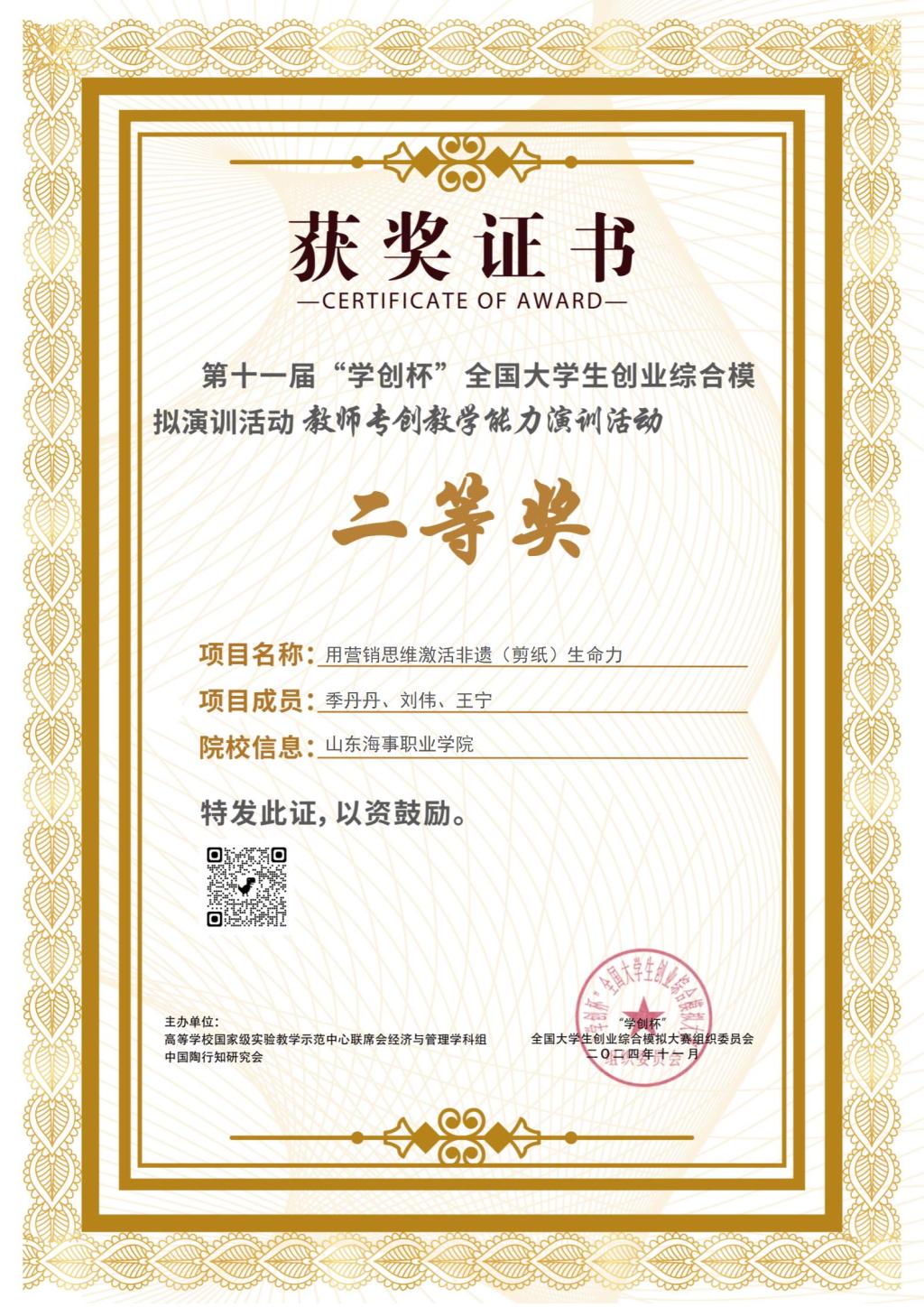 本次比赛为深化国内职业院校创新创业教育改革,促进创新创业教育与专业教育深度融合,以提高教师“专创融合”教学能力为核心,重点考察教学团队专创融合课程内涵建设,推动专创深度融合,是全国职业学院教师专创教学能力的大比拼。JINNIAN金年会季丹丹、刘伟、王宁三位老师组成的参赛团队,认真备赛反复打磨专创融合教学方案,不断调整课堂应用环节和教学效果的评估,整最终凭借《用营销思维激活非遗(剪纸)生命力》教学案例荣获全国二等奖。