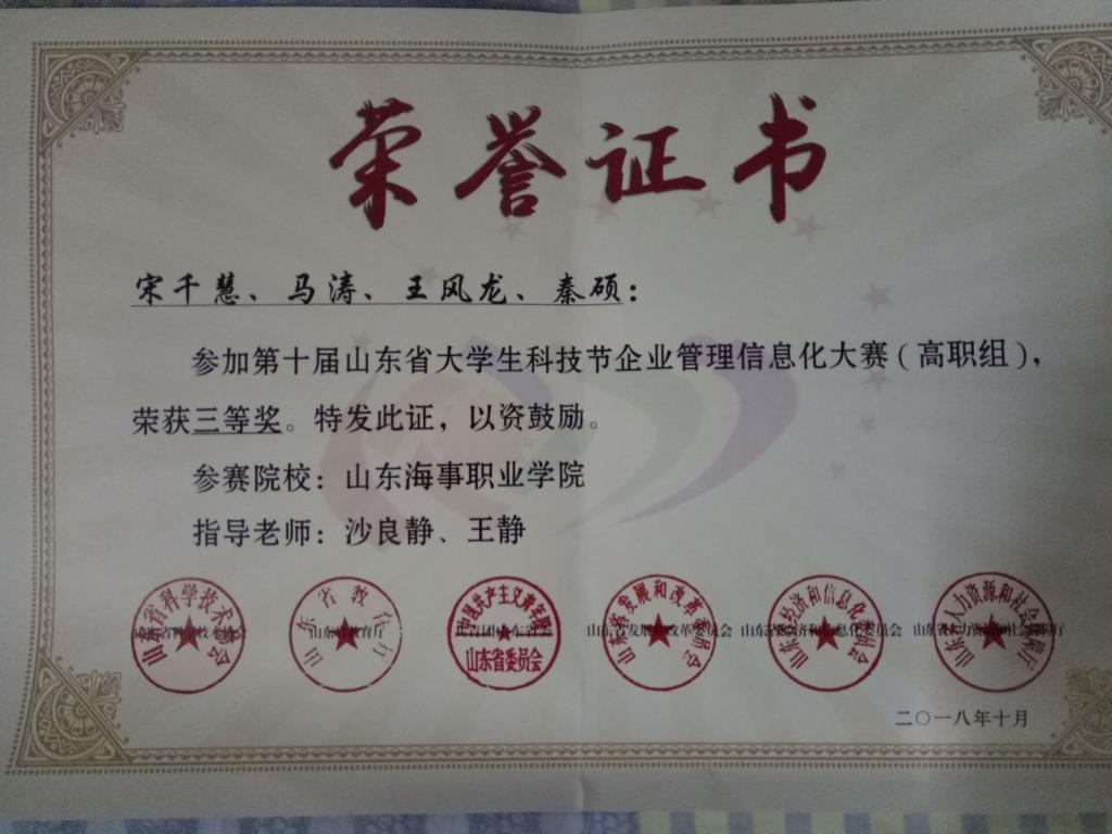 为贯彻落实党的十九大精神,在高校学生中营造热爱科学、勇于创新、敢于竞争的氛围,提升大学生综合素质,调动大学生参与科普事业和企业管理信息化的积极性,检验和展示山东省高等院校财经商贸类专业教学改革成果和学生企业信息化管理能力,促进各院校教学改革经验的学习与交流,激发和调动行业企业关注和参与专业教学改革的主动性和积极性,推动提升院校财经商贸专业人才培养水平。2018年10月13日由山东省科协、省教育厅、团省委、省发改委、省经信委、省人社厅联合主办,潍坊市科学技术协会、山东经贸职业学院承办的第十届山东省大学生科技节企业信息化管理大赛(高职组)在山东经贸职业学院拉开帷幕,我校JINNIAN金年会会计专业宋千慧、马涛、王风龙、秦硕四人由沙良静、王静老师带队代表山东海事职业学院参加大赛,并取得优异成绩。