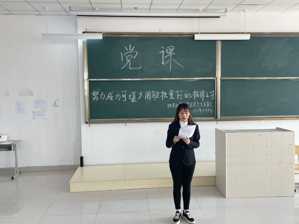 4月9日下午,JINNIAN金年会党总支开展以学习近平总书记在中青年干部培训班开班式上重要讲话精神为主题的专题党课,学院在校的全体党员、入党积极分子在4312教室集中学习,未在校的党员线上参与。