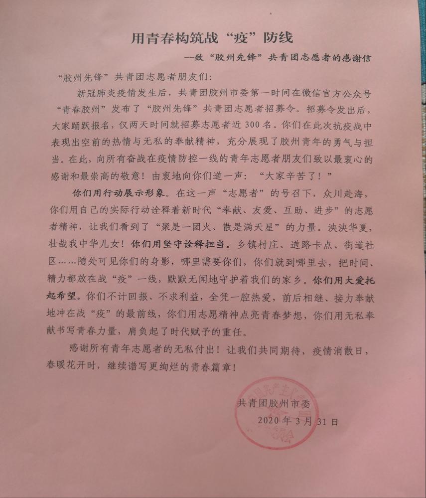 疫情开始之后,郑昕同学主动担当,坚持每天到村里卡点开展志愿服务,对过往车辆和进出的居民进行登记、发放核对出入证帮助开展检测体温和消毒、宣传疫情防控知识等工作。积极配合社区工作人员进行入户排查,共计排查了120户家庭,帮助各个村庄检查点发放疫情防控物资,并对各类信息进行汇总上报,累计志愿服务时长达305小时。近日共青团胶州市委给“胶州先锋”共青团志愿者发来了感谢信,肯定