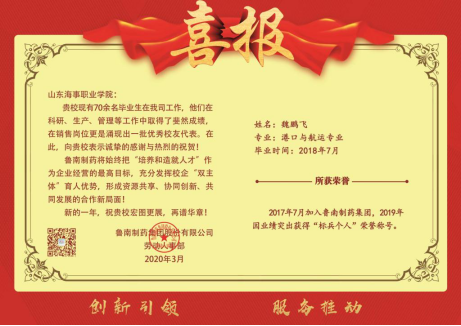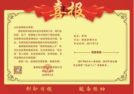日前,在2020年鲁南制药集团股份有限公司总结表彰会上,我校多名毕业生受到表彰奖励。其中金年会2017届物流管理专业毕业生常斌、2018届港口与航运管理毕业生魏鹏飞获得“标兵个人”荣誉称号,并获得5万-10万元的奖金。