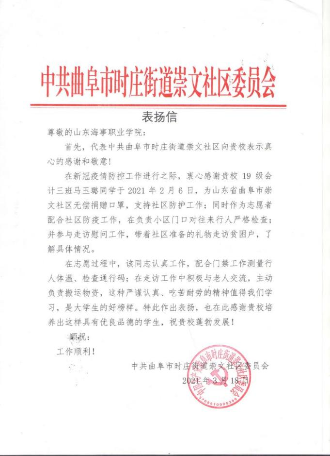近日,金年会官网收到分别来自中共曲阜市时庄街道崇文社区委员会发来的表扬信,分别对金年会19级会计3班马玉璐同学在抗疫当中的积极表现给予高度肯定和赞扬。