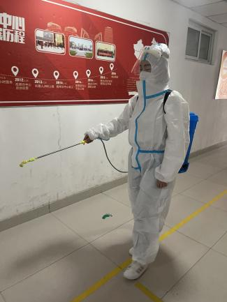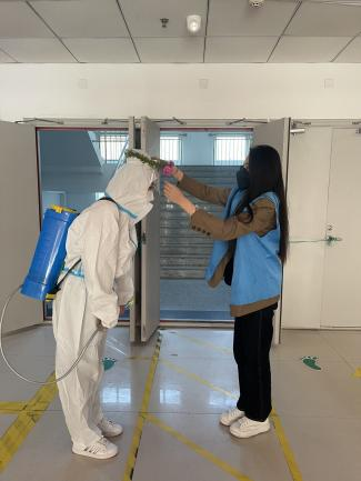 在这个春暖花开的季节,防护服穿上身,背上消毒器材,去教室、楼道各个学生所能触及到的地方消毒消杀。老师再忙再累,但每一个操作步骤都十分规范,确保排查工作全面,从而为疫情防控提供有力保障。而金年会的同学理解老师的辛苦,悄悄为老师送上了最美的花环。