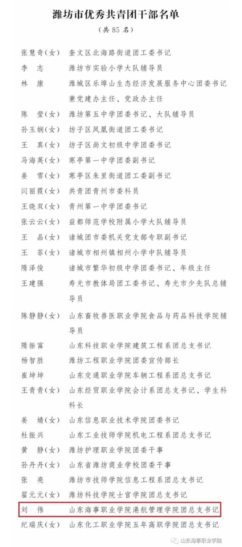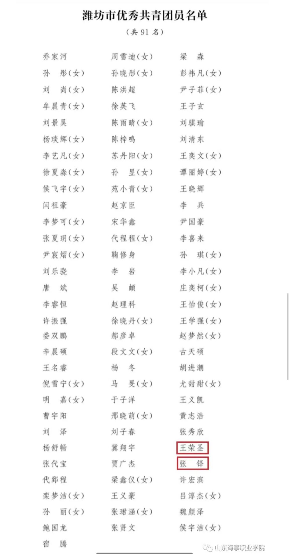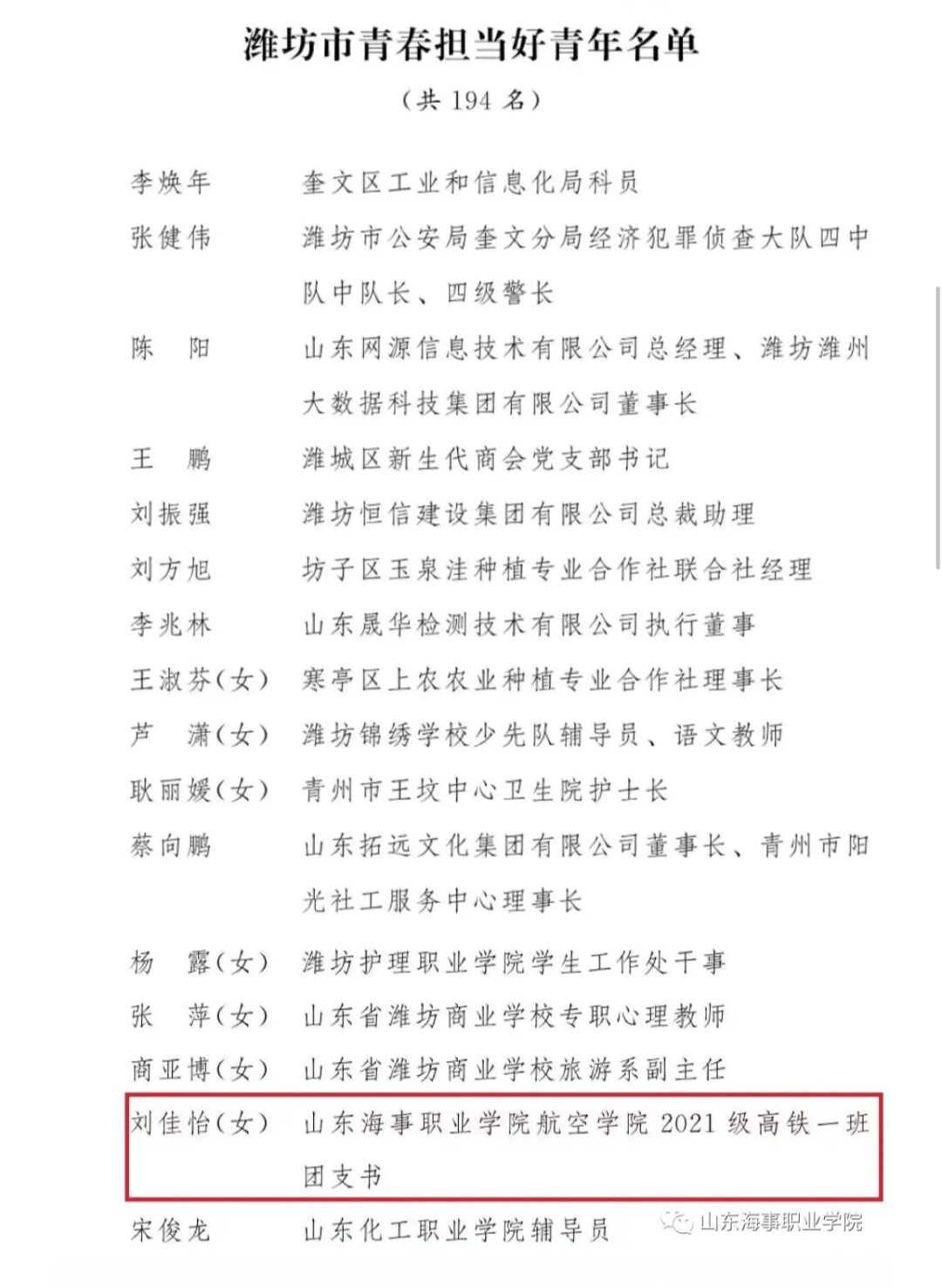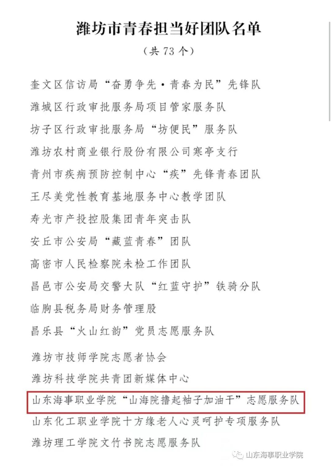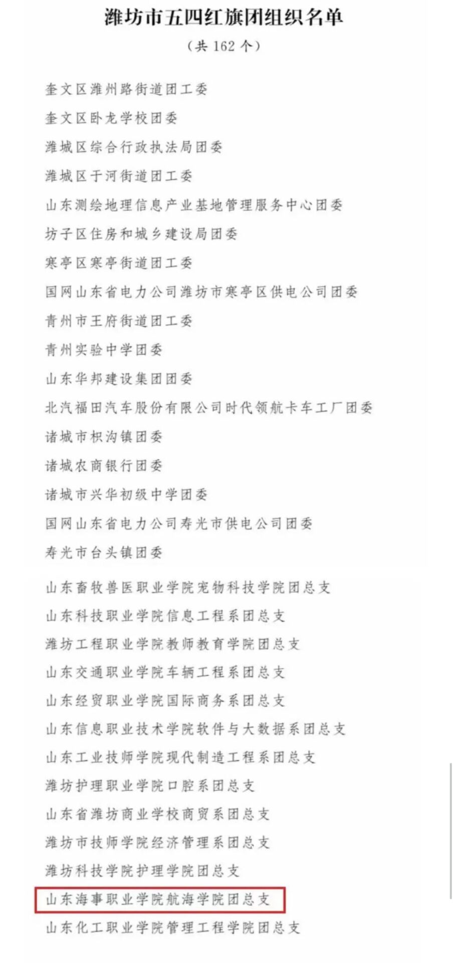 近日,共青团潍坊市委下发《关于表扬2021年度“潍坊市优秀共青团员”“潍坊市优秀共青团干部”“潍坊市五四红旗团组织”“潍坊市青春担当好青年(团队)”的通报》,我校机电工程学院王荣圣、五年制大专学院张铎荣获“潍坊市优秀共青团员”称号;JINNIAN金年会团总支书记刘伟荣获“潍坊市优秀共青团干部”称号;航海学院团总支荣获“潍坊市五四红旗团总支”称号;航空学院2021级高铁1班团支书刘佳怡荣获“潍坊市青春担当好青年”称号;“山海院撸起袖子加油干”志愿服务队荣获“潍坊市青春担当好团队”。