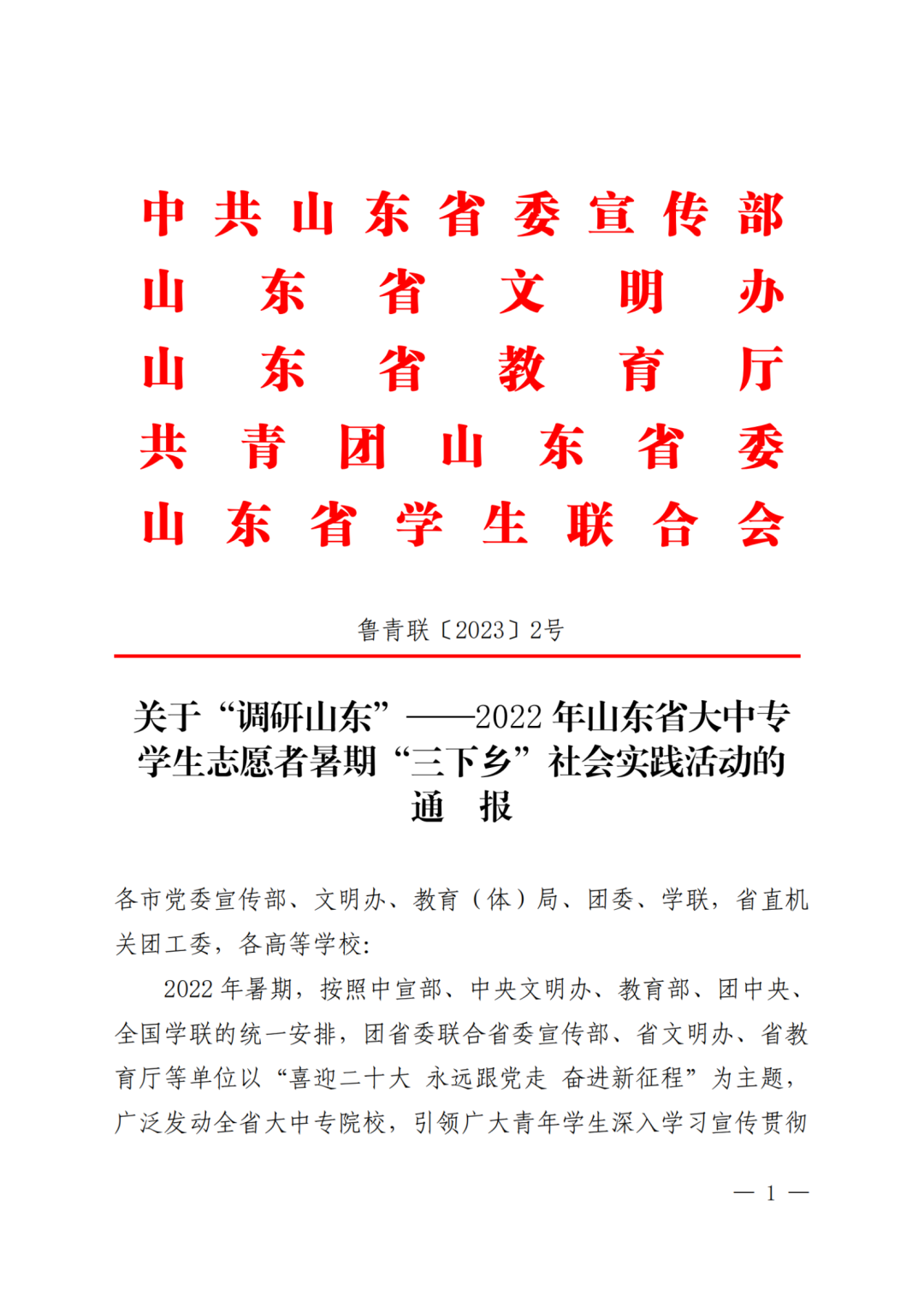 近日,中共山东省委宣传部、山东省文明办、山东省教育厅、共青团山东省委、山东省学生联合会发布《关于“调研山东”——2022年山东省大中专学生志愿者暑期“三下乡”社会实践活动的通报》