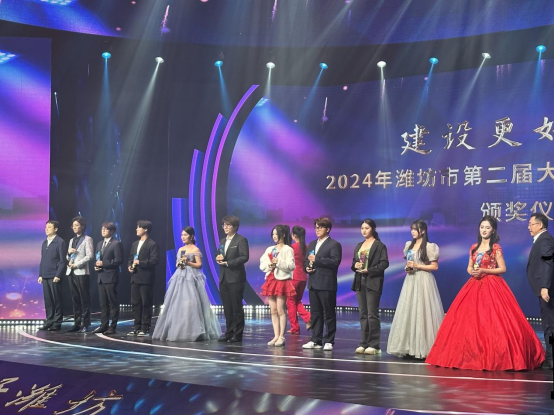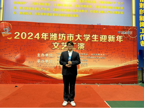 12月27日晚,2023年潍坊市第二届大学生校园歌手大赛颁奖典礼在潍坊市广播电视台演播厅举行,我校学生孙磊获“十佳歌手”称号。