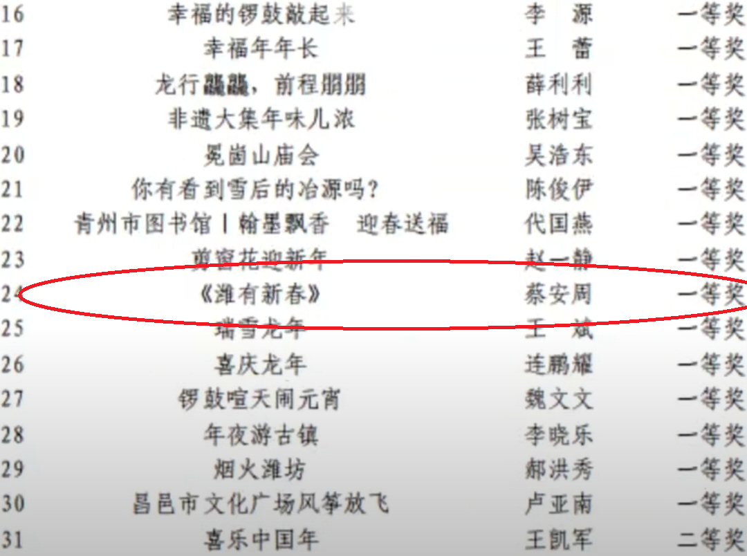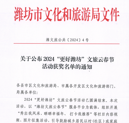 近日,潍坊市文旅局公布《2024“更好潍坊”文旅云春节活动获奖名单》,JINNIAN金年会学子2022级关务2班蔡安周提交的作品《潍有新春》荣获一等奖!