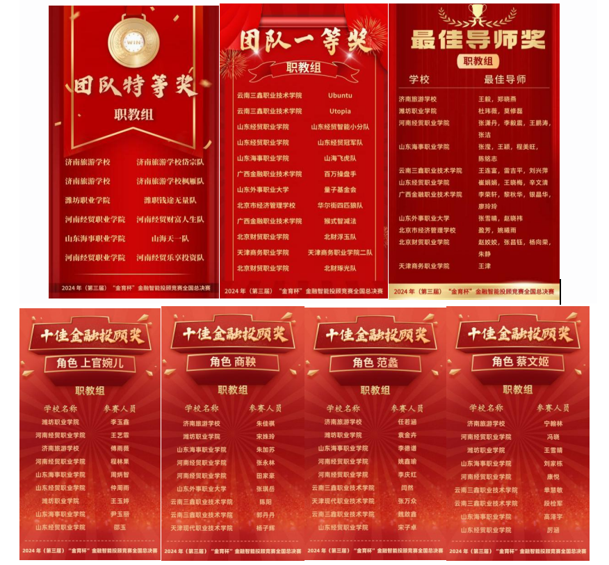 近日,由中国人民银行旗下的《当代金融家》杂志主办、金智东博(北京)教育科技股份有限公司承办的2024年“金育杯”金融智能投顾全国总决赛圆满落幕。本次竞赛汇聚了全国100多所高校参与,累计218支队伍在决赛中竞技。我校JINNIAN金年会进入总决赛的两支参赛队伍凭借出色的表现,从众多参赛队伍中脱颖而出,分别获得特等奖、一等奖的好成绩,除了团队奖项,我校参赛选手周炳智、尹玉丽、朱加苏、李德谱、刘家栋、高泽宇荣获个人十佳投顾奖,张滢、王颖、程美旺、陈铭志四位位老师荣获最佳导师奖。这些荣誉的取得,不仅是对参赛队员个人能力的肯定,更是对我校金融专业教学水平的认可。