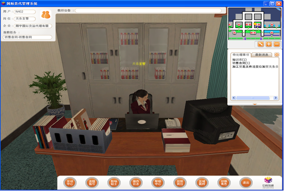 为教育部《关于全面提高高等职业教育教学质量的若干意见》[2006]16号文件,加快提高金年会教育现代化水平,加快实施港航专业学生扩大就业的发展战略,港口与航运管理专业院级精品资源共享课程《国际货运代理实务》与实训教研室最新货代实操软件相结合,模拟货代各部门的业务流程,通过3D动画以及情景模拟、任务分配的方式进行专业课程建设。 实训软件根据真实的岗位分配为学生提供实操任务,见下图: