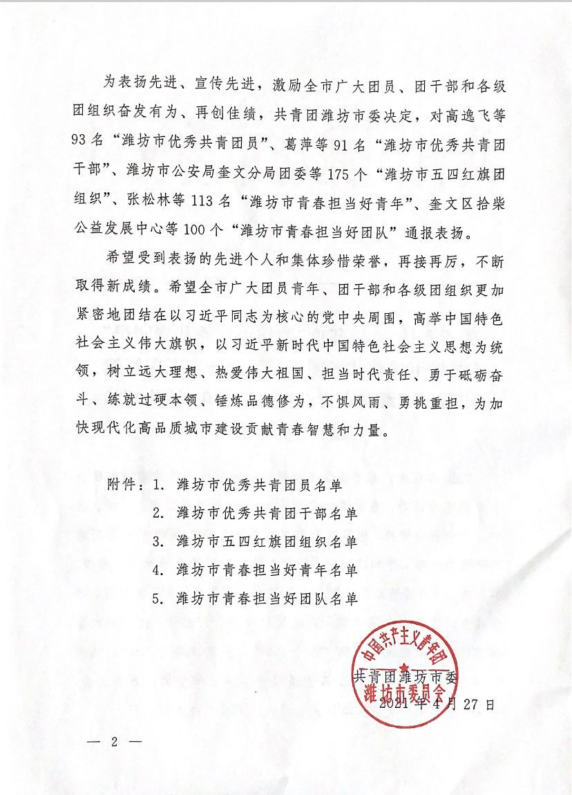 JINNIAN金年会团总支荣获“潍坊市五四红旗团组织”称号
