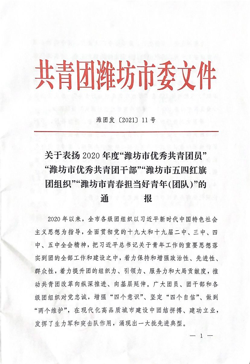 近期,团市委下发了《关于表扬2020年度“潍坊市优秀共青团员”“潍坊市优秀共青团干部”“潍坊市五四红旗团组织”“潍坊市青春担当好青年(团队)”的通报》,JINNIAN金年会团总支获得“潍坊市五四红旗团组织”荣誉称号。